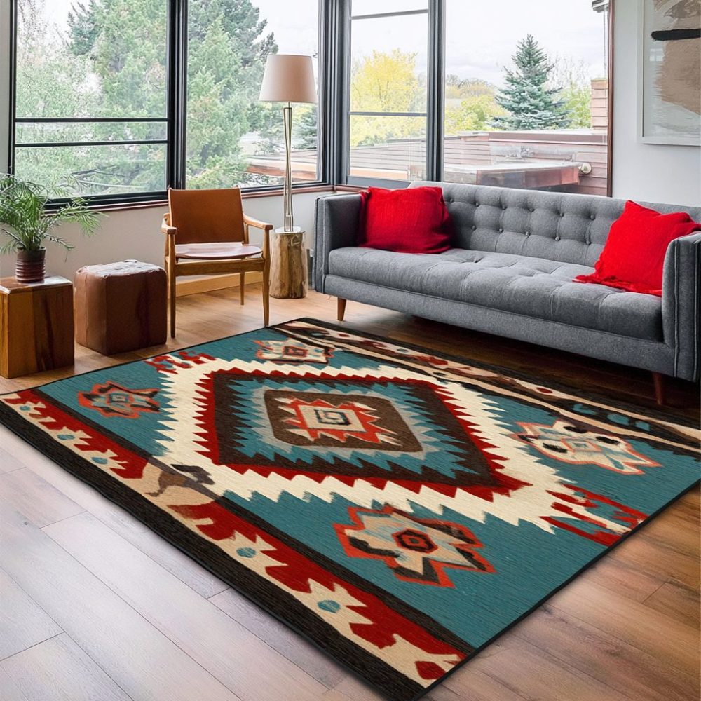 rust orange rug,Southwestern accent rug,boho living room rug,dining room rug,low-pile durable rug,desert flame decor,vibrant area rug