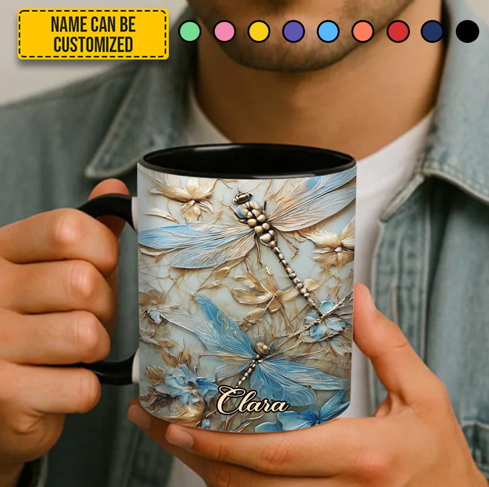- High quality ceramic mug with two-tone rim, interior, & handle