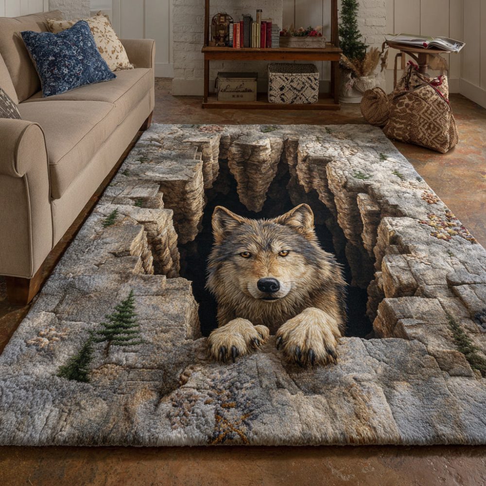 echo wolf den rug, wolf motif rug, cabin rug, lodge area rug, forest scene rug, rustic living room rug, adventure room decor, entryway rug