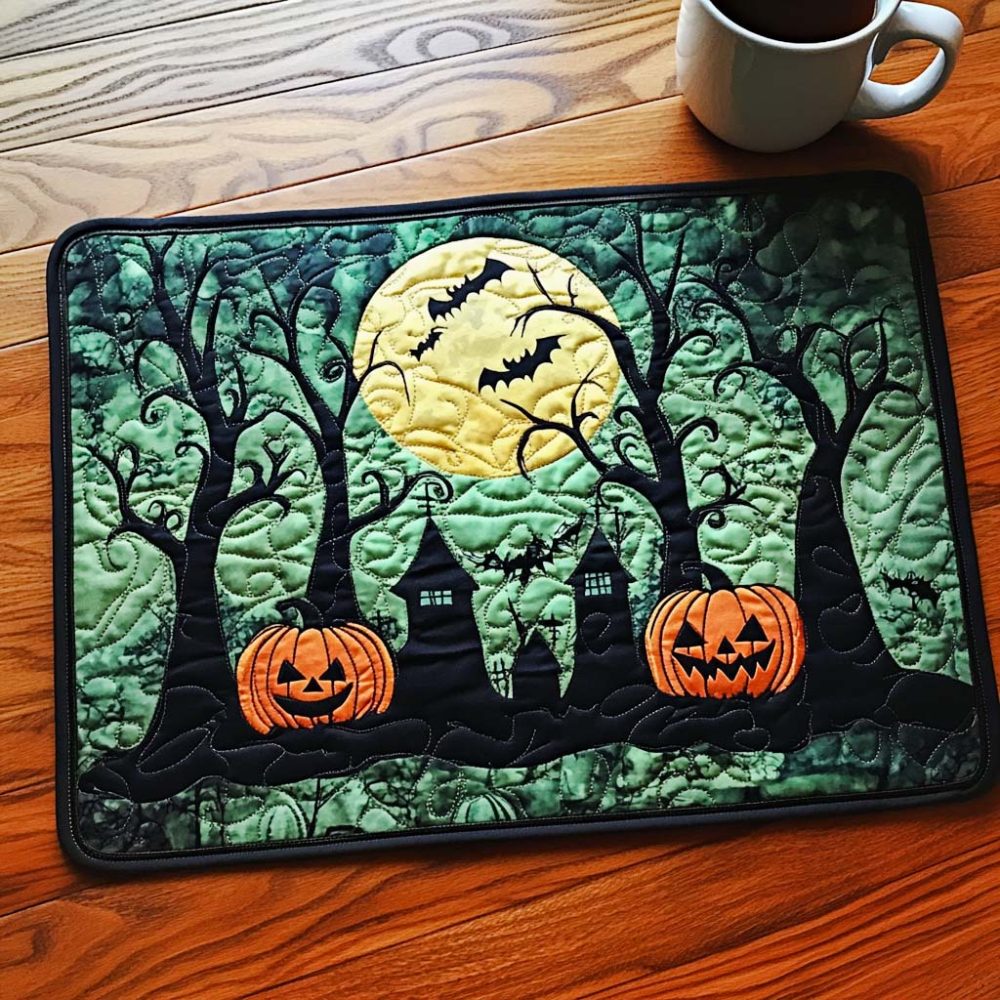 spooky placemat, Halloween table decor, quilted placemat, cotton blend placemat, heat-resistant placemat, reversible placemat, non-slip table mat