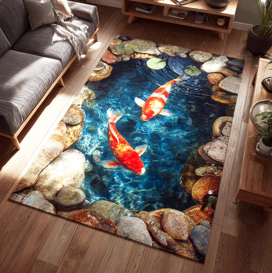 emerald koi rug,koi pool rug,fish pond rug,artistic area rug,low-pile durable rug,entryway rug,bathroom rug,indoor accent rug