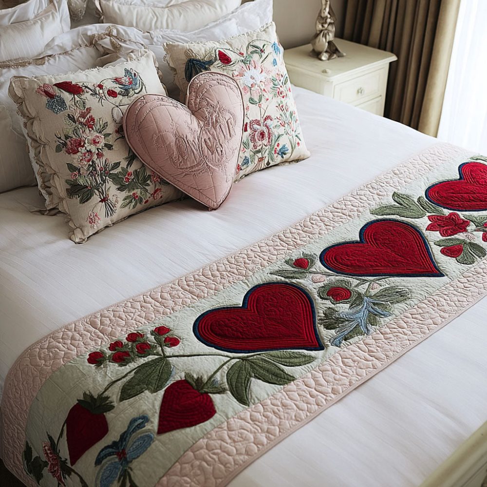 eternal hearts bed runner,quilted bed scarf,reversible bed runner,cotton blend runner,romantic bedding,decorative bed scarf,layered bedding accessory,machine washable