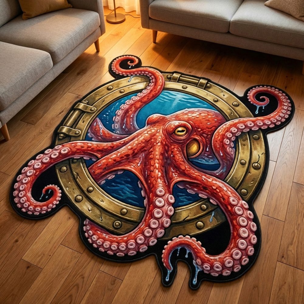 Eye-Catching Golden Kraken Shaped Rug — Custom Cut Nautical Statement Piece, Durable Indoor Accent, Non-Slip Backing, Multiple Sizes
