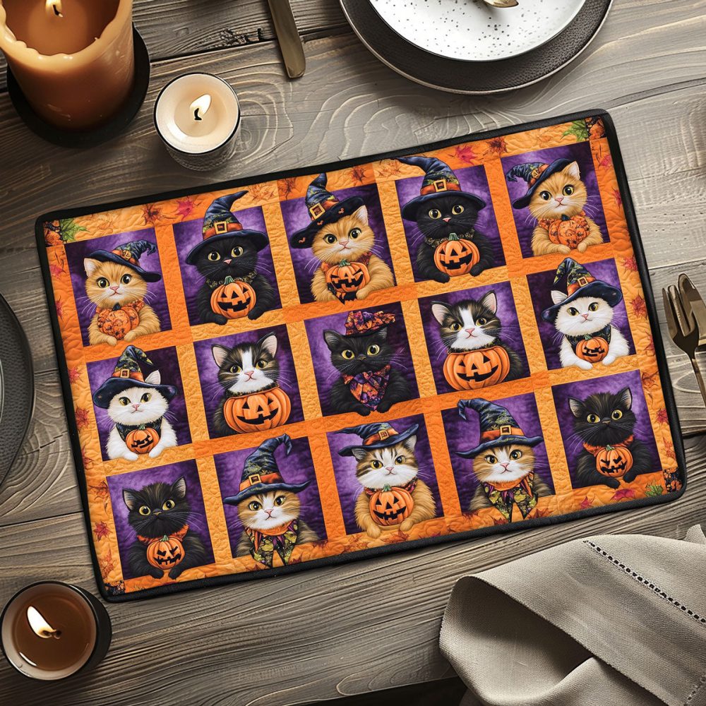 feline witch placemat, black cat placemat, Halloween table decor, quilted placemat, machine washable placemat, heat resistant placemat, cotton blend