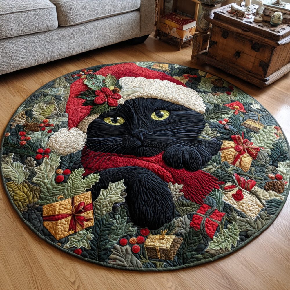 Festive Black Cat Quilted Round Mat