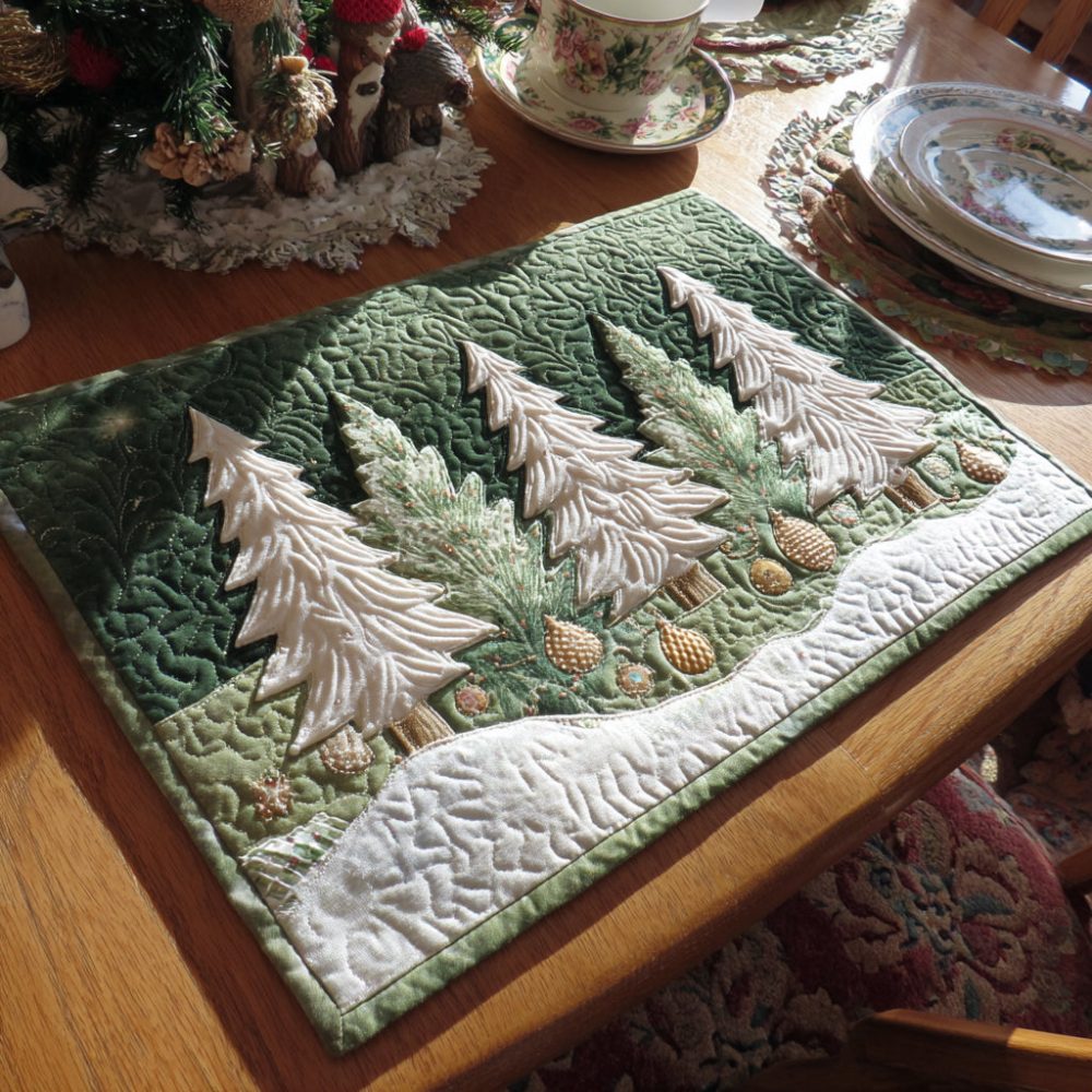 evergreen placemat, quilted placemat, holiday table decor, Christmas table mat, insulated placemat, machine washable placemat, festive tableware