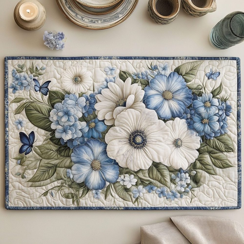Floral Charm Quilted Placemats – Blooming Elegance Table Mats, Cotton Blend Dining Protectors, Machine Wash Friendly