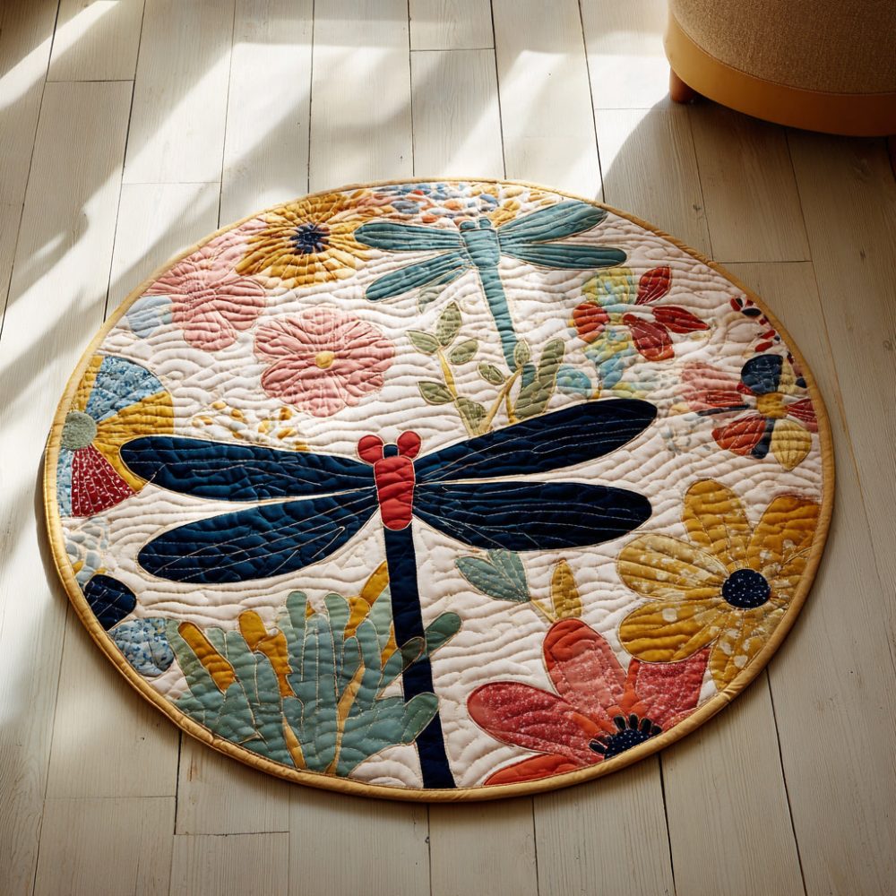 Floral Dragonfly Quilted Round Mat