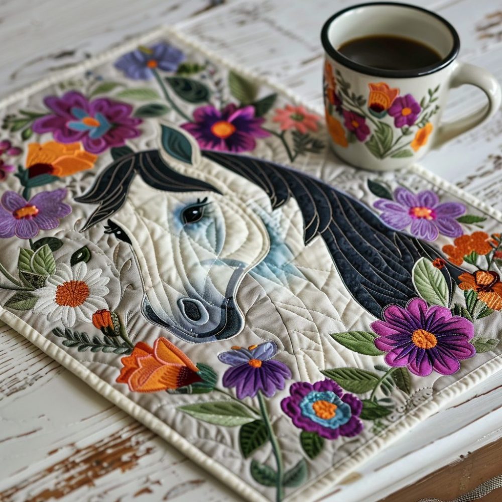 quilted placemat, horse placemat, floral table decor, farmhouse placemat, cotton blend placemat, machine washable placemat, dining table mat, meadow design placemat, country kitchen decor, protective placemat