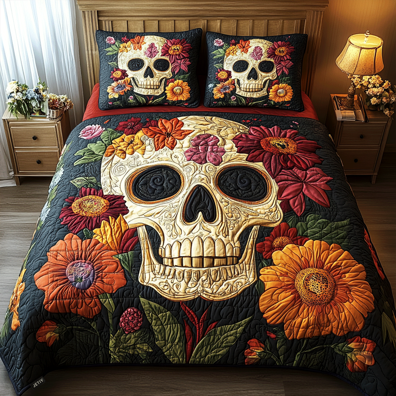 Floral Skull Charm 3-Piece Quilted Bedding Set