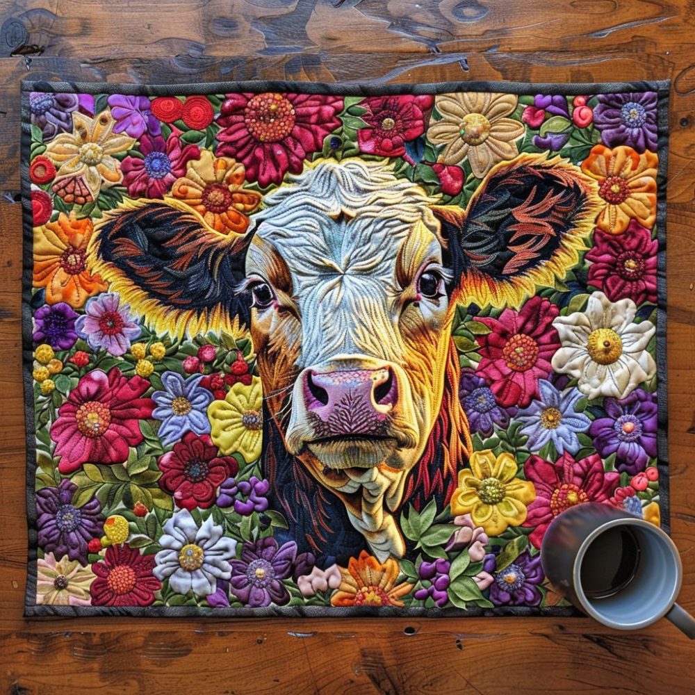 cow placemat, farmhouse placemat, quilted placemat, country kitchen decor, floral cow design, washable table mat, rustic table accessory
