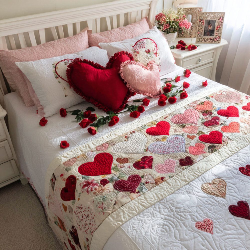 forever heartscape bed runner,quilted bed scarf,heart landscape bedding,romantic bedroom decor,quilted accent,bedroom styling,decorative bed throw,timeless bed runner,layered bedding,elegant home decor