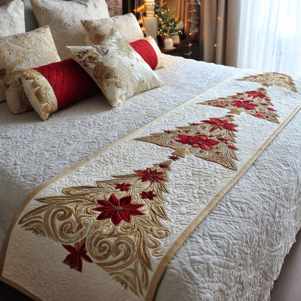 frosted whisper bed runner, icy floral bed scarf, winter quilted bed runner, holiday bedroom accent, soft quilted throw, elegant bedding accessories