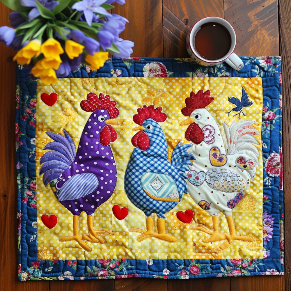 funky bird placemat,colorful bird table decor,quilted placemats,feather friends placemat,machine washable placemat,durable cotton placemat,bright table accents