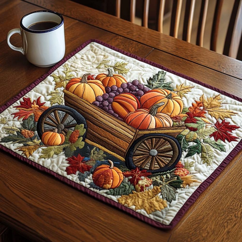 gourd placemat, autumn placemat, pumpkin placemat, quilted table mat, insulated placemat, seasonal table decor, fall placemat