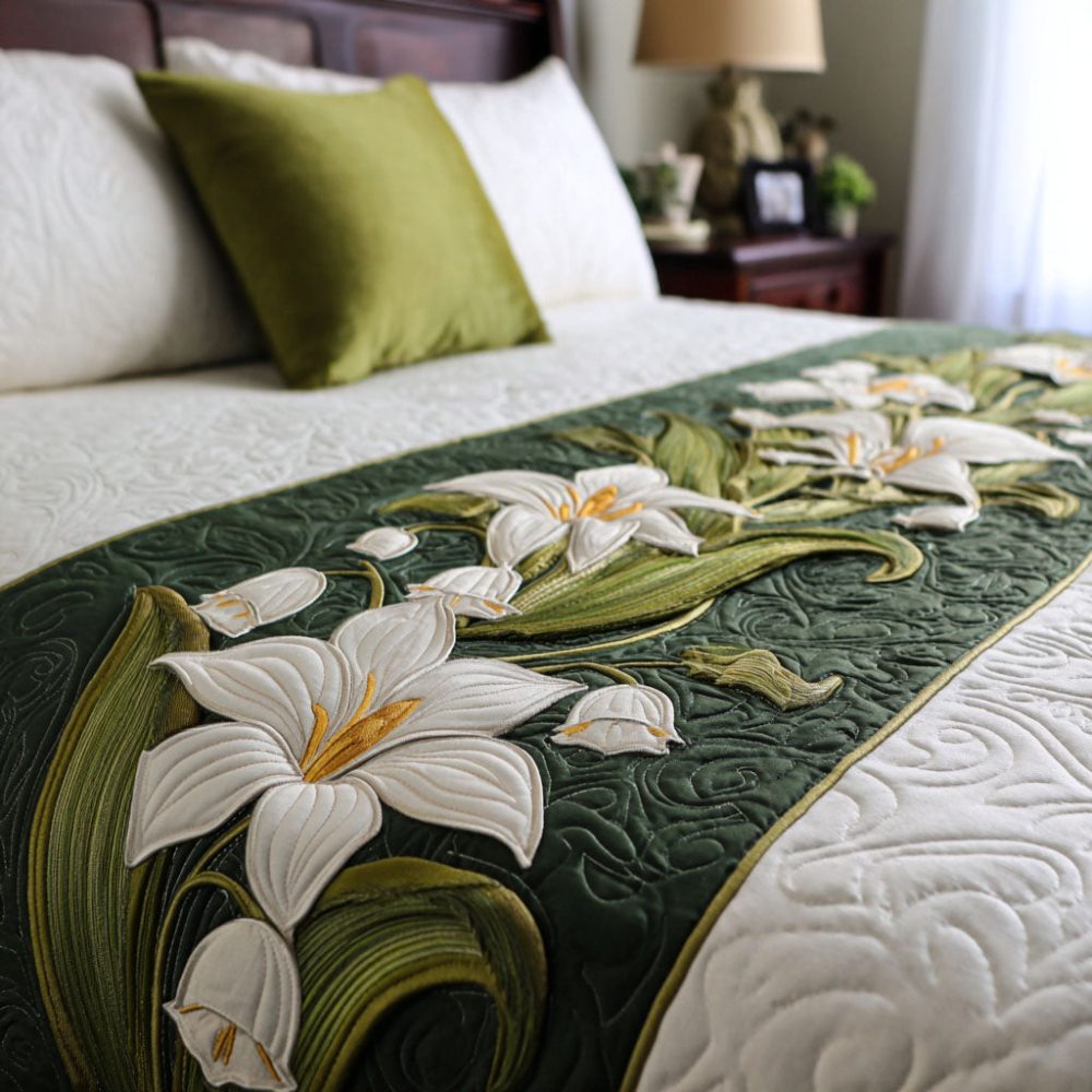 green bed runner, botanical bed scarf, quilted bed runner, green haven reverie, natural bedroom decor, breathable bedding, machine washable bed runner, durable