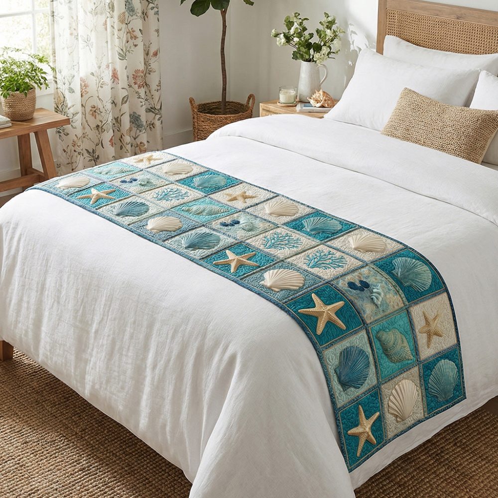 gulf stream bed runner, ocean wave bedding, quilted bed scarf, coastal throw, beach style decor, cotton blend runner, breathable bedding, machine washable