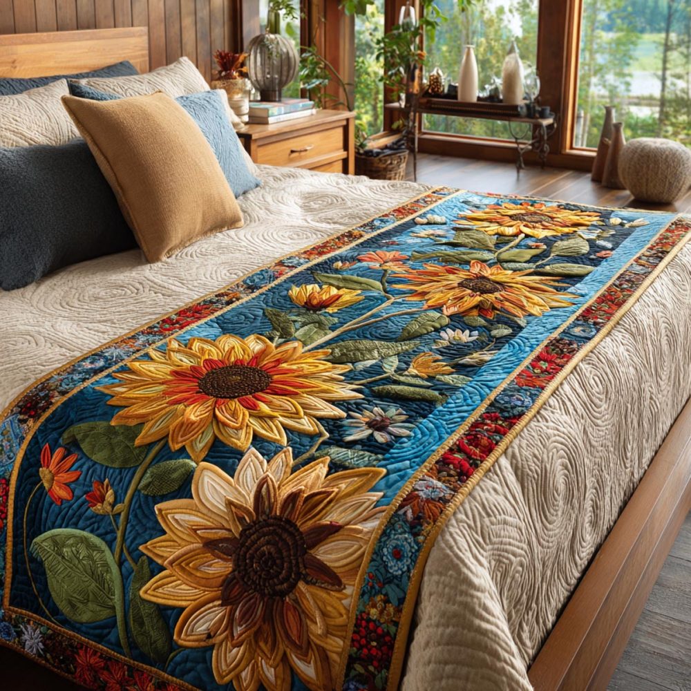 Harvest Sunflower Quilted Bed Runner — Autumn Floral Bed Scarf, Soft Cotton-Blend, Reversible Design For Queen/King Beds