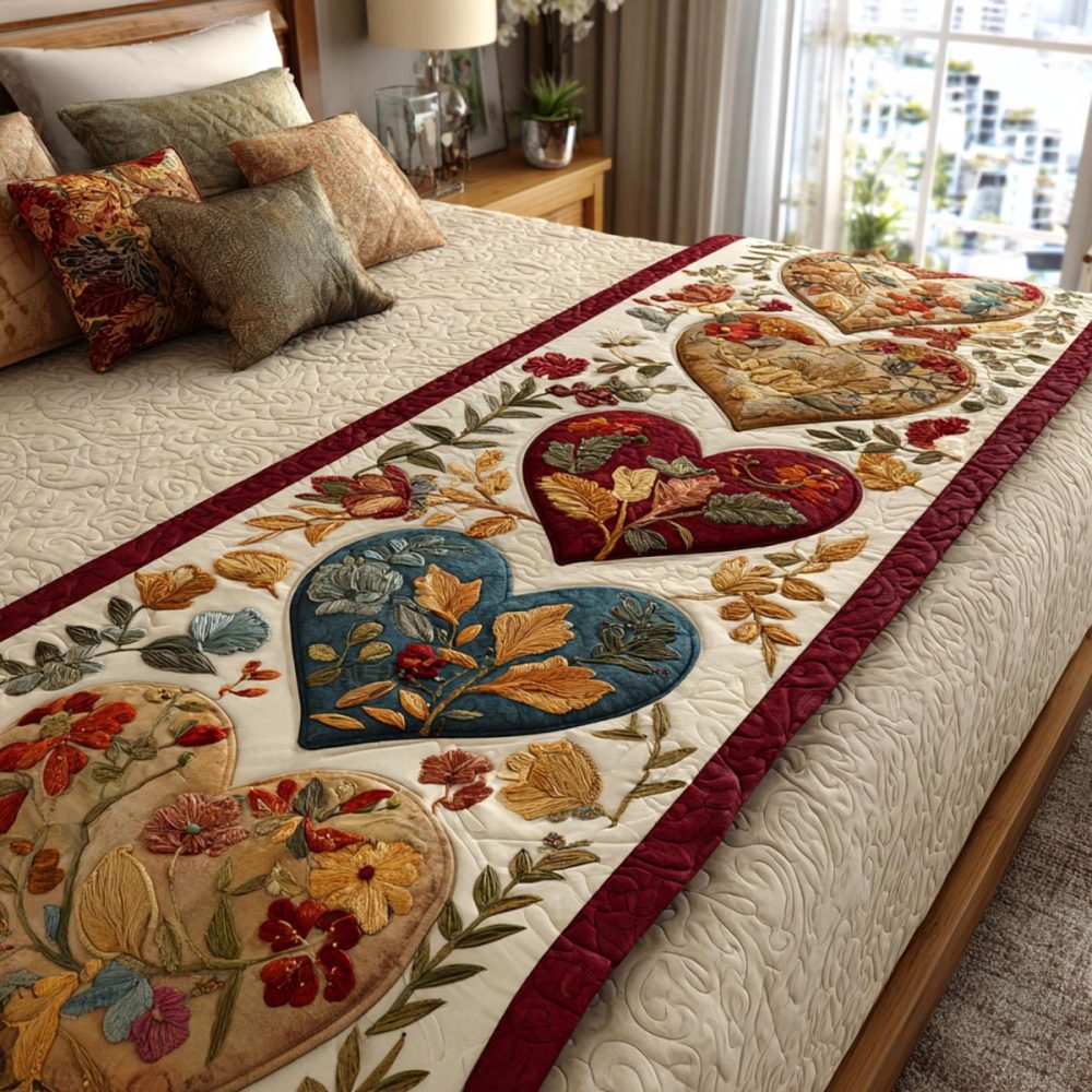 heart bloom bed runner,floral heart bed scarf,quilted bed scarf,lightweight bed runner,decorative bedroom accent,queen bed runner,king bed runner,machine washable
