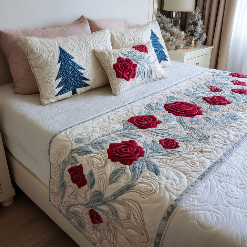 heartland roses bed runner,rose bed scarf,quilted floral runner,cottage bedding,romantic bed runner,quilted accent,bedroom refresh,decorative bed throw,vintage-inspired bedding,layered look