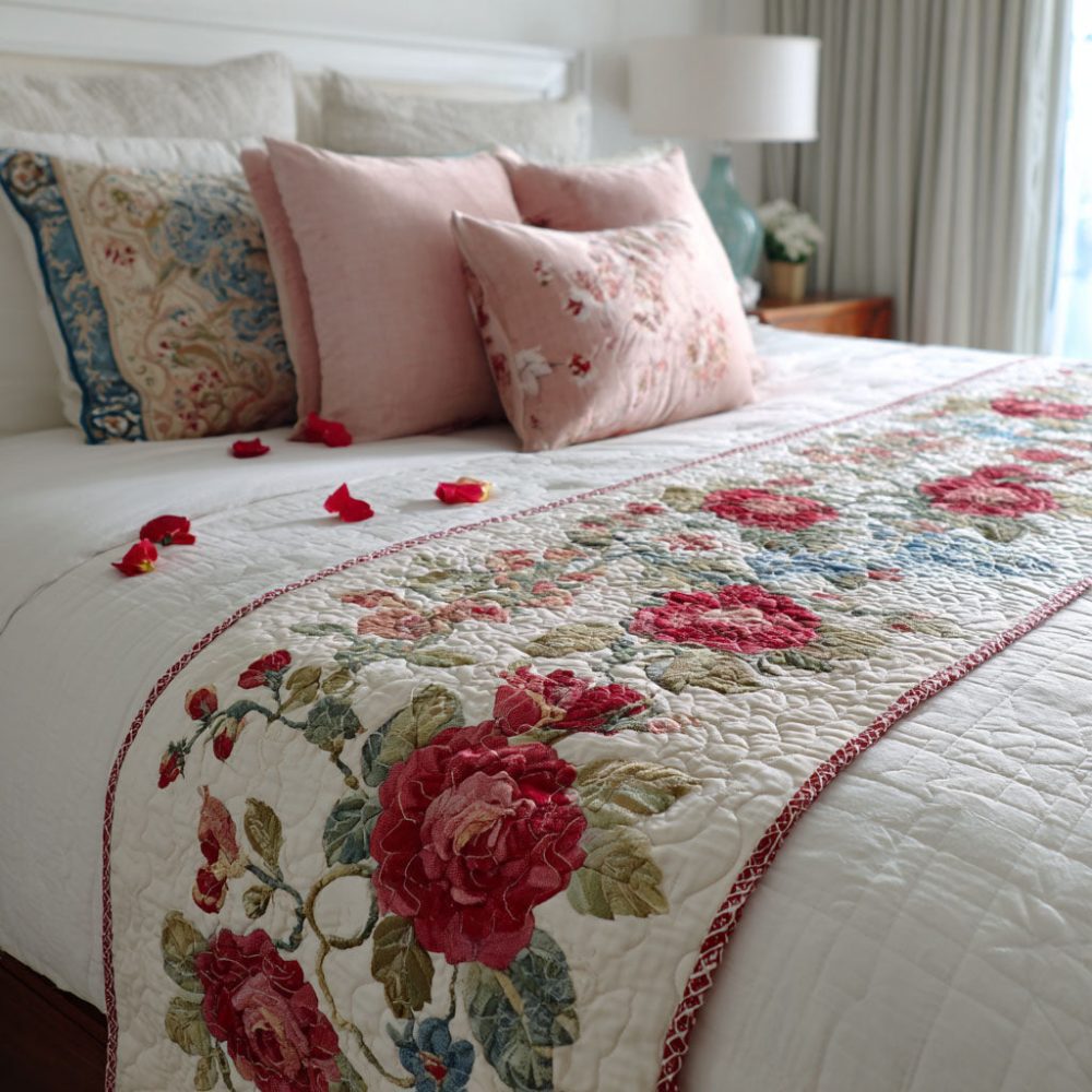 heartlight garden bed runner,botanical bed scarf,quilted heart runner,farmhouse bedroom decor,cottage bed runner,quilted accent,decorative bed throw,layered bedding,guest room decor,floral heart bedding