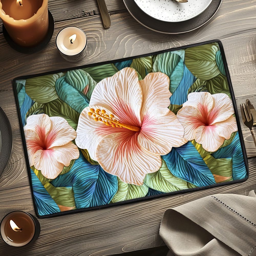 Bring bold hibiscus blooms to your table with a quilted placemat that celebrates tropical color and texture. The padded quilt surface shields tabletops while showcasing vivid floral design for summer dinners, outdoor meals, or island-inspired gatherings. Lightweight and versatile, it’s a stylish way to brighten everyday dining and seasonal celebrations.