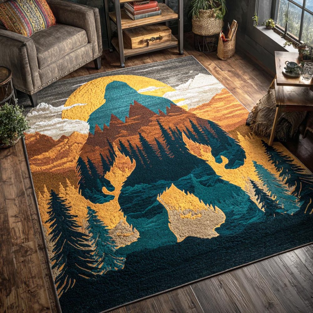hidden beast rug,forest motif rug,distressed area rug,rustic rug,low-pile accent rug,cabin decor rug,moody area rug,durable rug