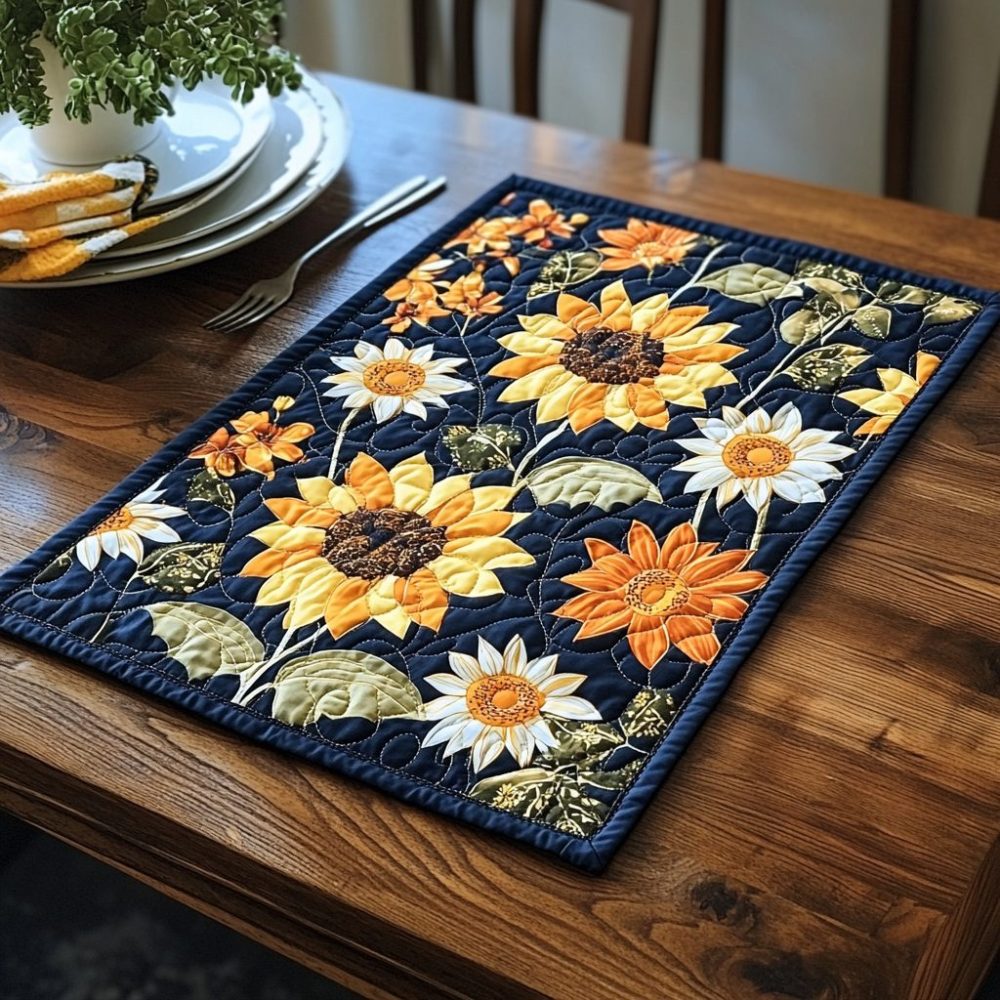 playful sunflower placemat,fun quilted placemat,bright table mat,fade resistant placemat,durable placemat,machine washable,kitchen gift