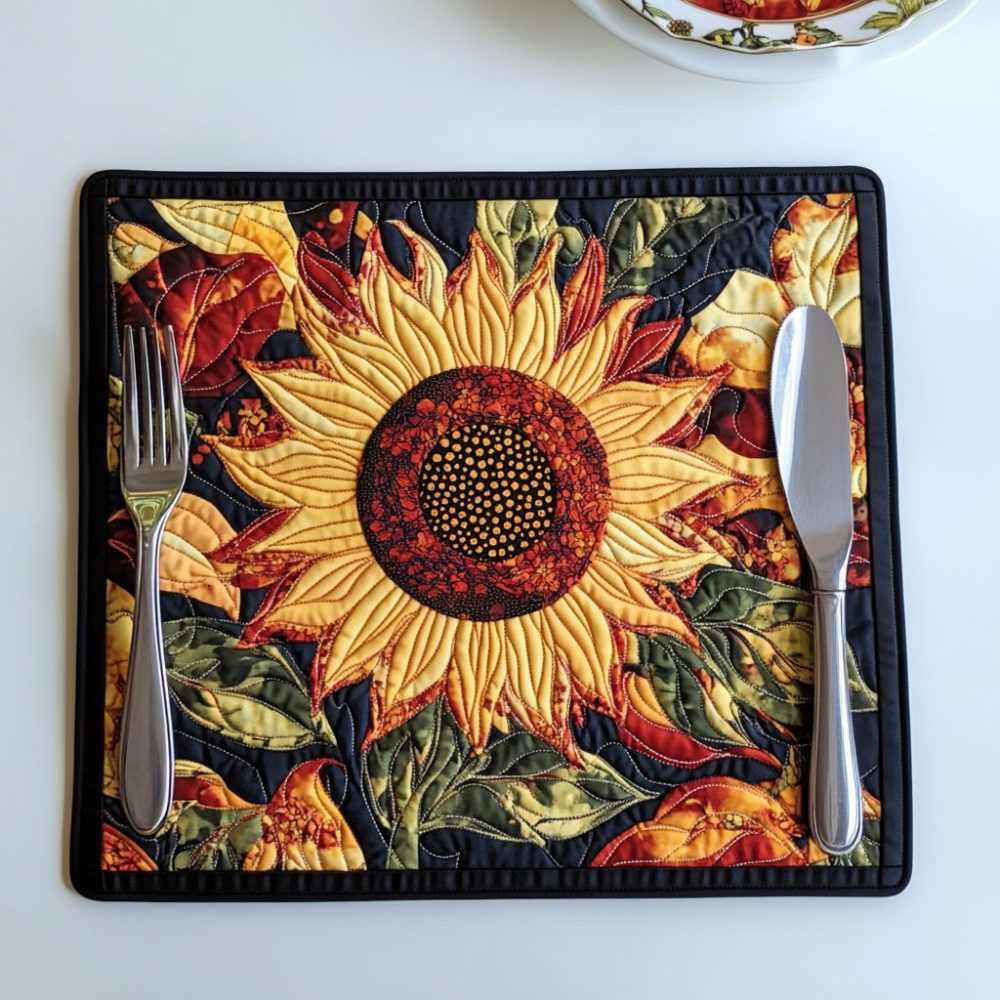 hilarious sunflowers placemat,funny sunflower placemat,whimsical quilted placemat,durable dining mat,machine washable placemat,cheerful table decor