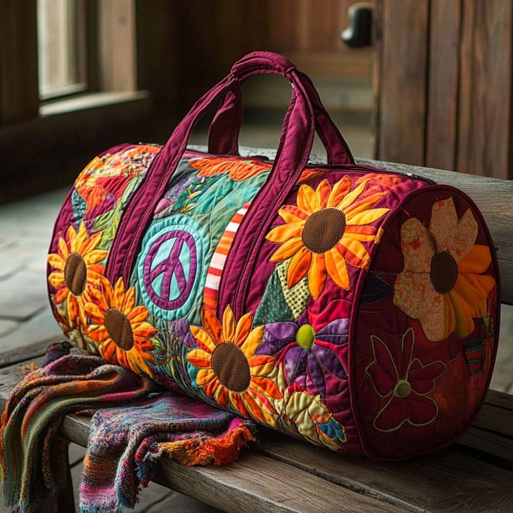 Stand out on every trip with the Hippie Glow Quilted Duffle Bag, featuring a radiant psychedelic tie-dye and peace-flower motif inspired by 1960s boho culture. The quilted exterior adds padded structure while roomy interior pockets make it ideal as a travel carry-on, gym or weekend overnight bag. Lightweight, durable, and uniquely colorful, it’s perfect for festival goers, yogis, and retro-lovers who want a functional statement piece.