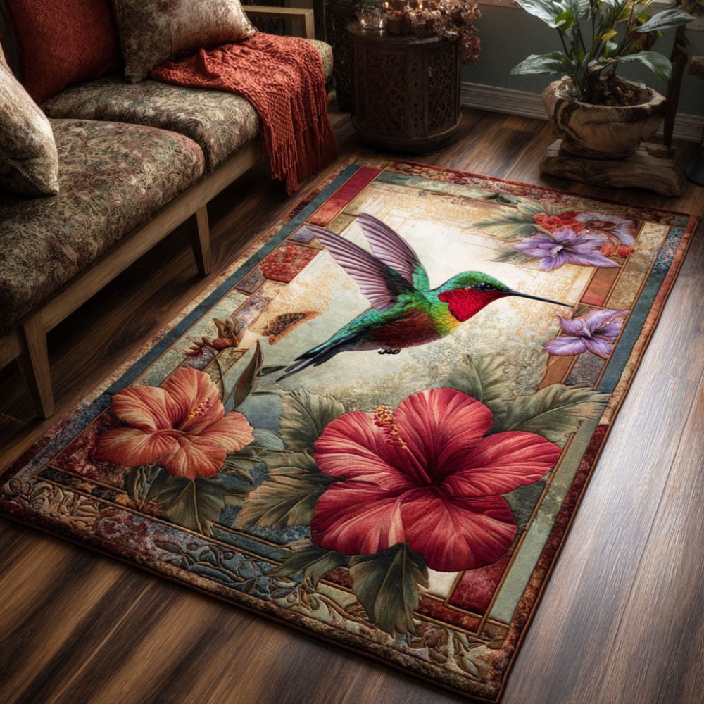 Humming Bloom Floral Area Rug — Vibrant Hummingbird & Flower Design, Soft Low-Pile Accent Rug For Living Room & Bedroom Décor