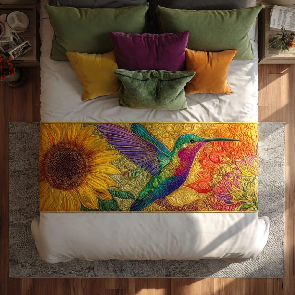 Hummingbird Dance Quilted Bed Runner — Artistic Bird Motif Bedding Accent, Soft Quilted Throw For Serene Bedroom Styling