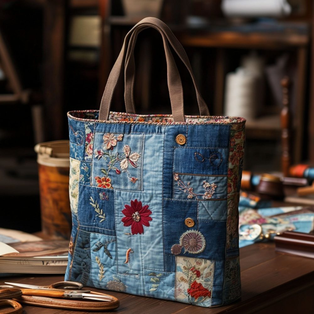 Indigo Flowers Quilted Tote Bag