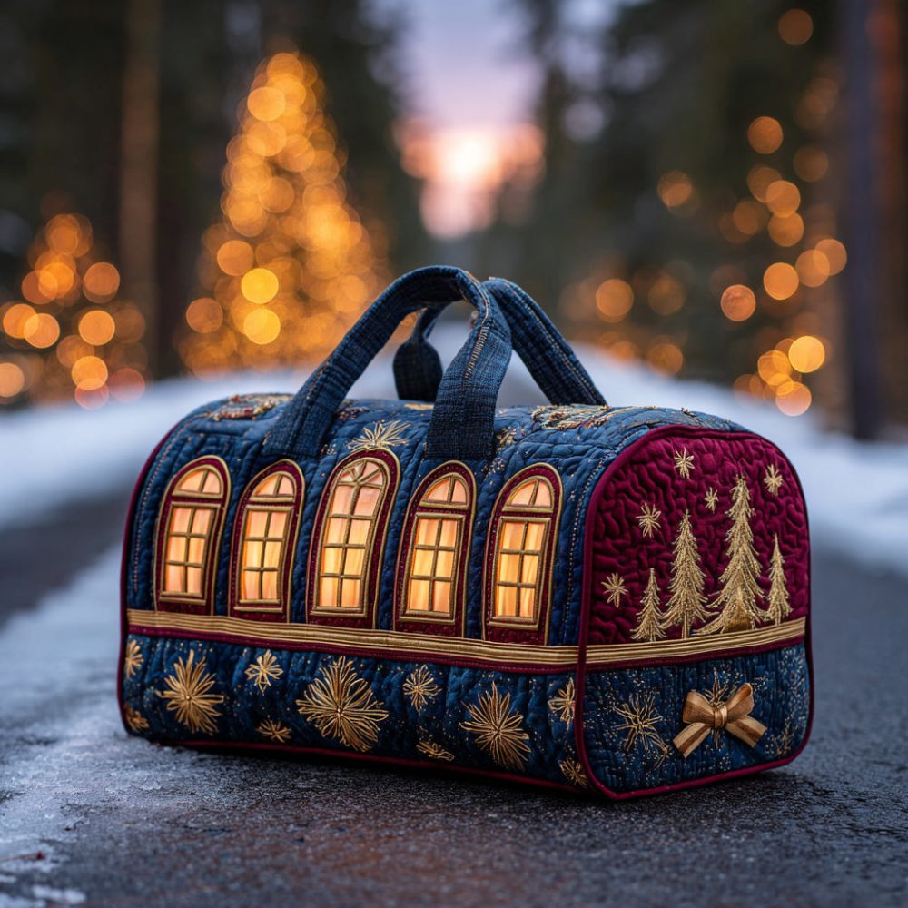 Christmas duffle bag,quilted duffel,holiday travel bag,christmas travel bag,jingle bell bag,train print bag,festive weekender,overnight duffel,carry-on duffel,holiday gift idea,seasonal travel accessory,vintage holiday style,whimsical christmas,festive gym bag,travel bag for holidays,unique christmas gift,quilted holiday accessory