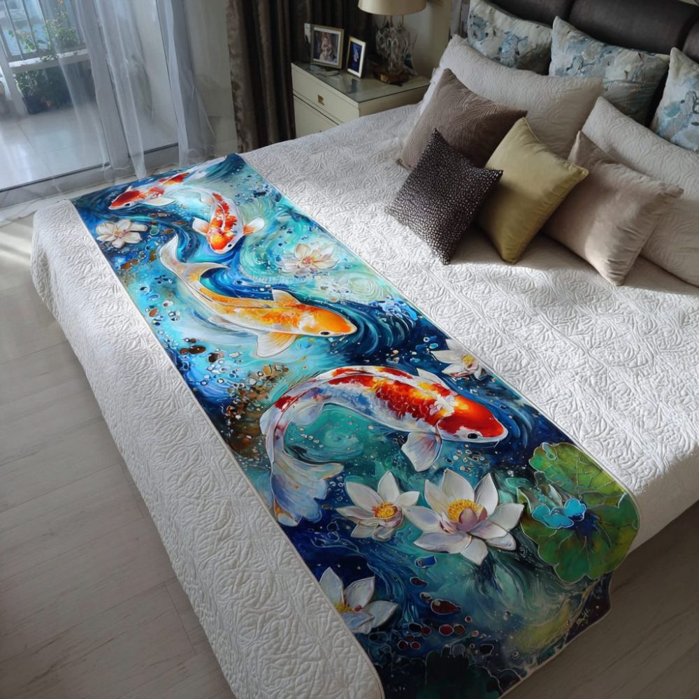 Koi Serenity Quilted Bed Runner — Serene Koi Artwork On Soft Quilted Cotton, Decorative Runner For Bedroom, Bench Or Sofa