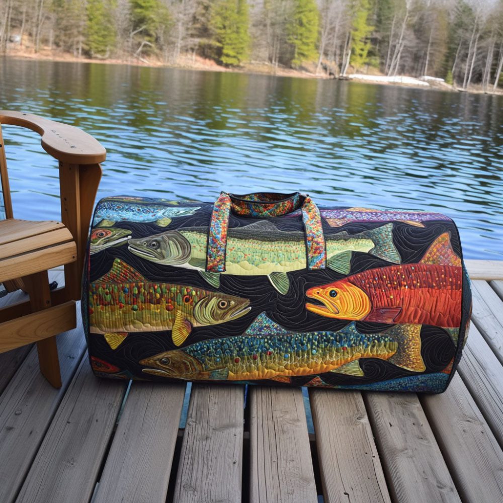 quilted duffle bag,lake trout bag,fish print duffel,fishing travel bag,angler gear,outdoor duffel,weekend bag,overnight bag,carry-on duffel,gym duffel,nature print bag,wildlife print bag,fly fishing gift,cabin trip bag,rustic travel bag,quilted travel bag,printed duffel,boating bag