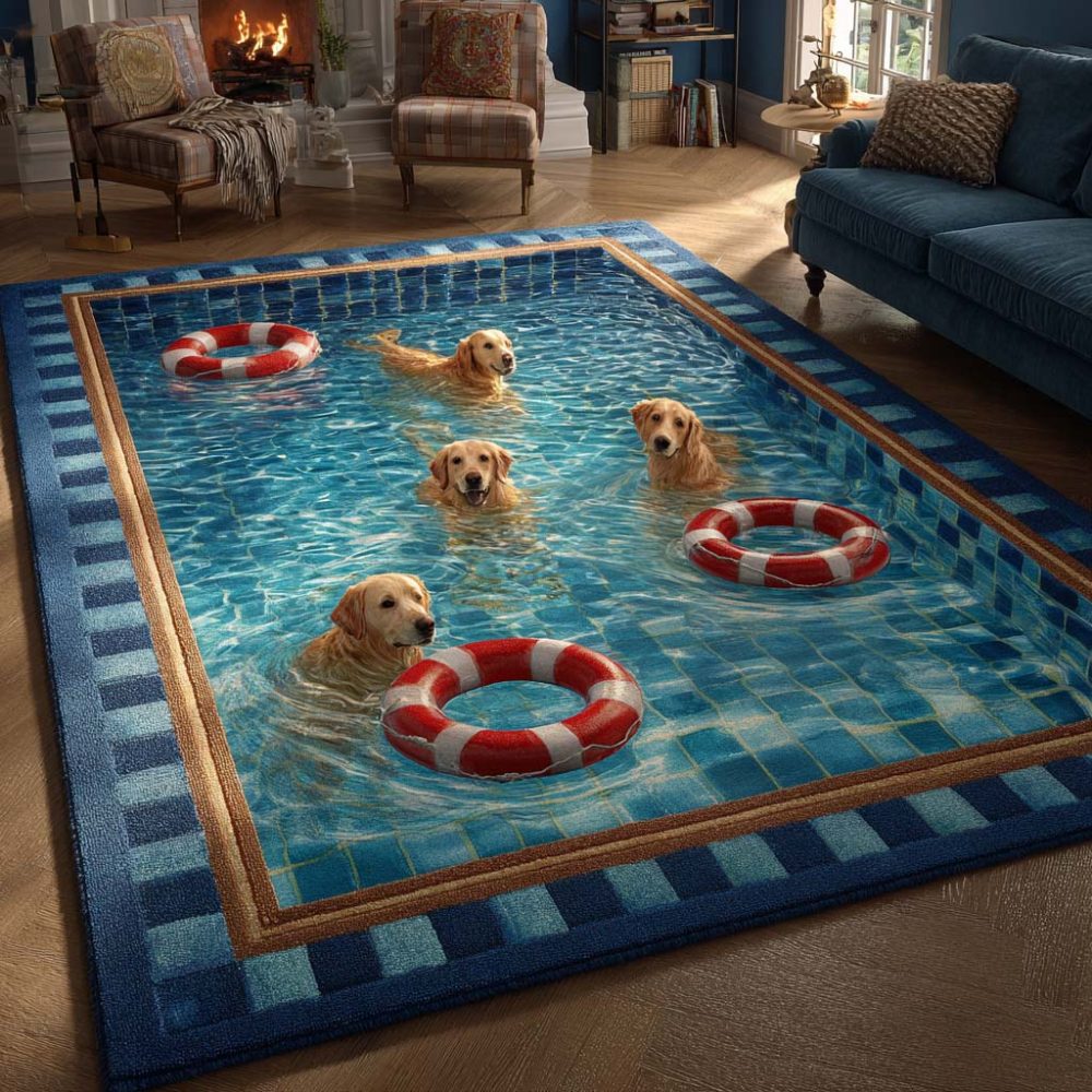 golden retriever rug,dog rug,pet-themed area rug,lifelike dog rug,plush area rug,non-slip rug,living room rug,nursery decor,pet mat