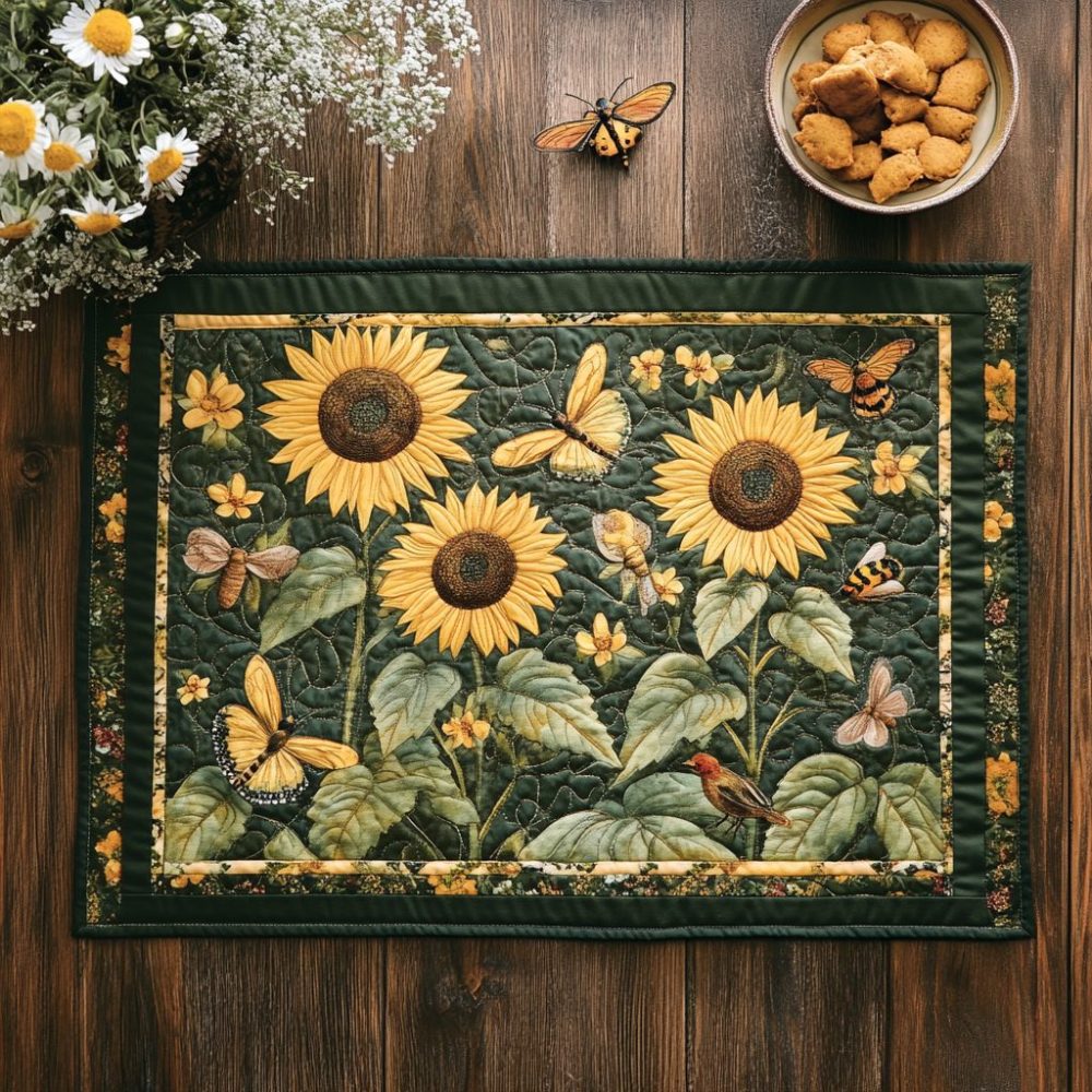 Light up your table with the Bright Sunflowers quilted placemat — cheerful yellow blooms with cozy farmhouse appeal. Quilting provides cushioned protection and a textured look while the durable fill is easy to wash. Ideal for summer brunches or autumn gatherings; mix with seasonal linens for a warm, inviting table.