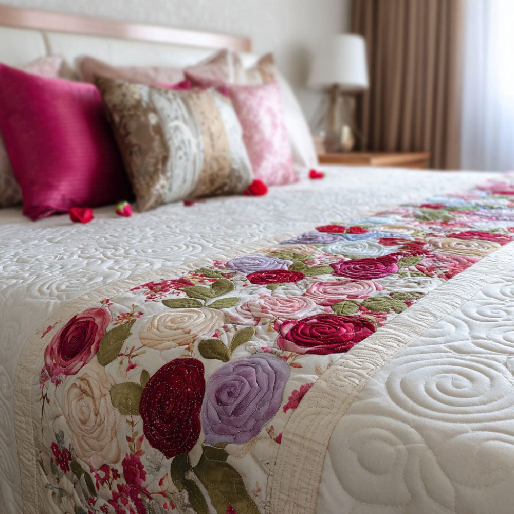 love bouquet bed runner,quilted bed scarf,floral heart bedding,romantic bed runner,bedroom makeover,quilted accent,layered bedding,cottage chic decor,decorative runner,soft texture