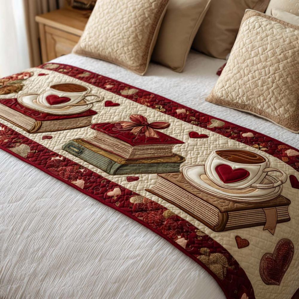 love chapters bed runner,quilted bed scarf,book inspired bedding,heart design runner,stylish bedroom accent,soft quilting,machine washable