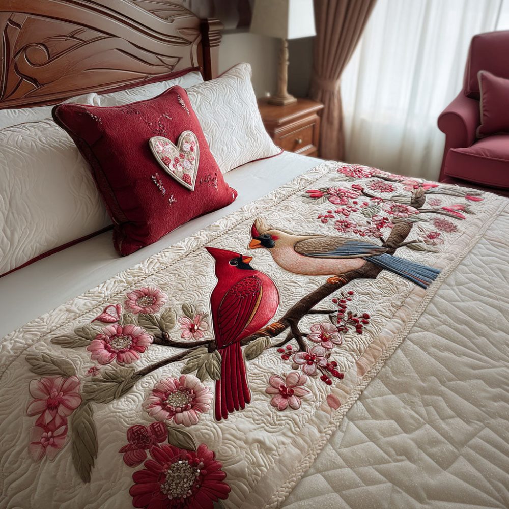 Lovebird Harmony Quilted Bed Runner – Romantic Bird & Floral Bed Scarf For Queen & King Beds, Decorative Bedding Accent