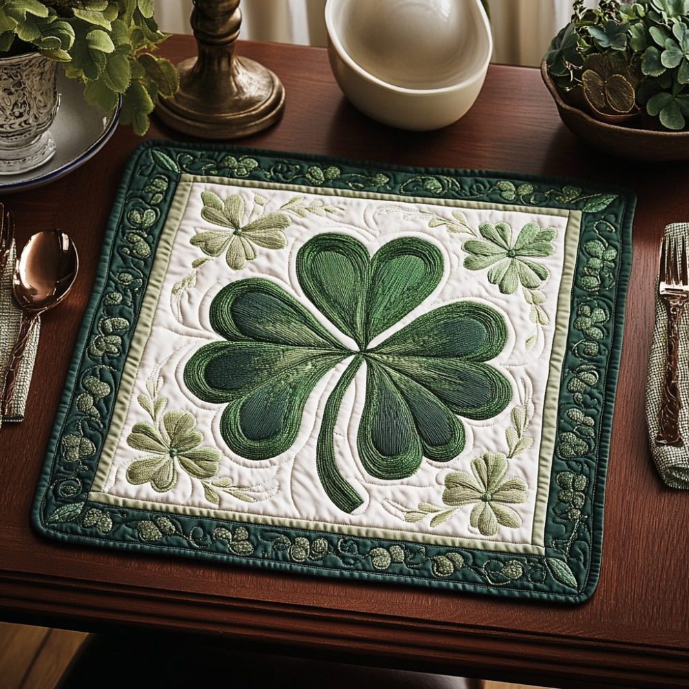 St. Patrick’s placemat,clover placemat,green quilted mat,seasonal table decor,cotton dining placemat,festive table setting,lucky greens placemat,holiday tableware