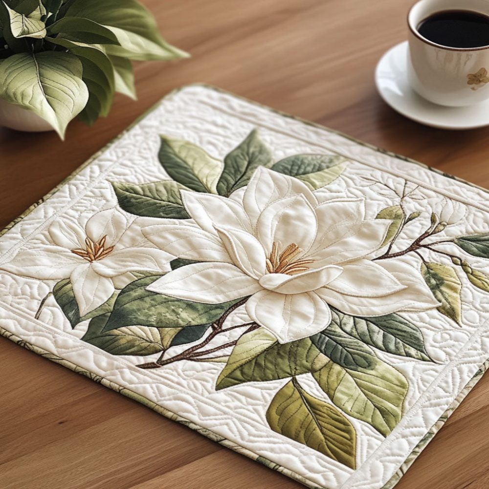 magnolia placemat,quilted magnolia placemat,floral table mat,cotton placemat,elegant table decor,heat resistant placemat,machine washable