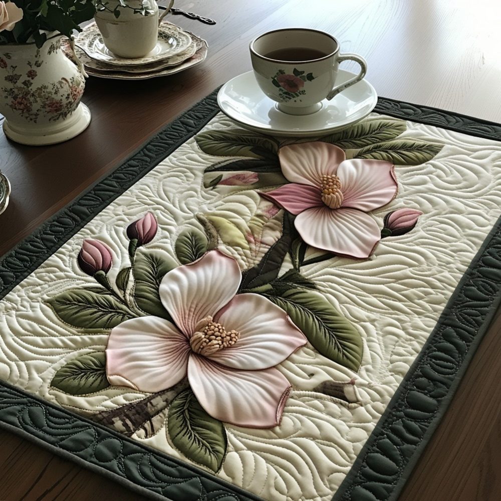 magnolia placemat,southern floral placemat,quilted luxury placemat,cotton blend placemat,stain-resistant placemat,reversible table mat,holiday table decor