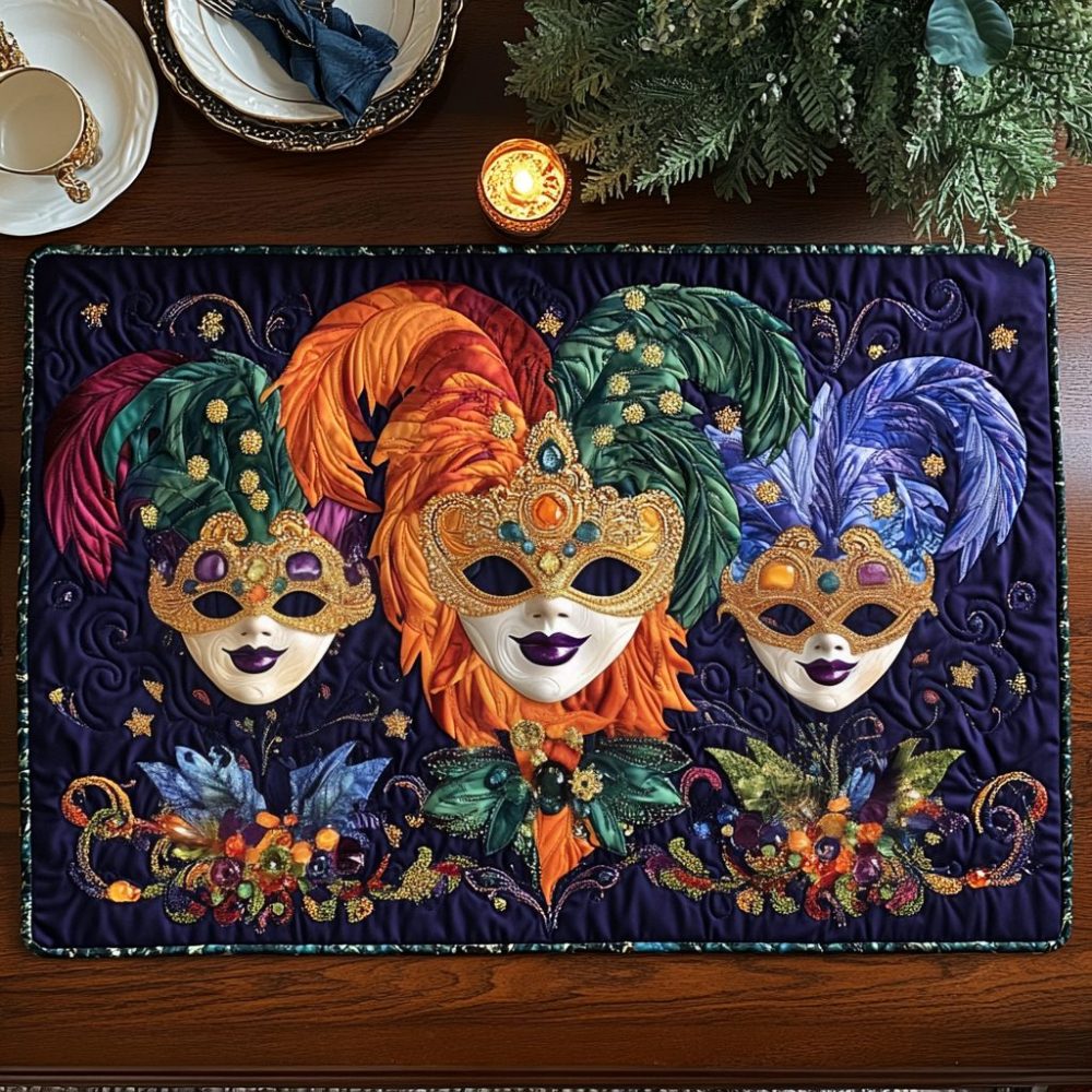 Bring a touch of masked mystique to your table with this Masked Elegance quilted placemat. Stylish patterning and plush quilting offer designer appeal while protecting surfaces from everyday messes and hot dishes. Built for convenience with machine-washable fabric and a non-slip underside for reliable place settings. Ideal for hosting, everyday elegance, or gifting to lovers of unique tableware.