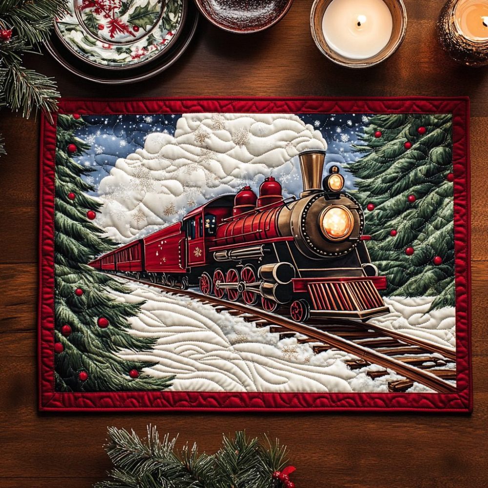 Bring playful train-themed cheer to your dining table with the Merry Locomotive quilted placemat. Soft yet durable cotton-blend construction with cushioned quilting offers heat resistance and spill protection while enhancing holiday tablescapes. Easy-care design is machine-washable and colorfast for repeated seasonal use. Ideal for family gatherings, kids’ holiday place settings, and gift-ready festive table decor.