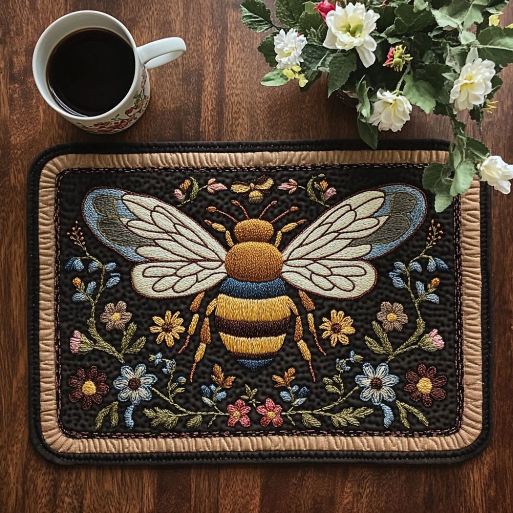 midnight blossom placemat,bee floral placemat,quilted dining mat,dark floral table mat,elegant placemat,protective table pad,kitchen decor