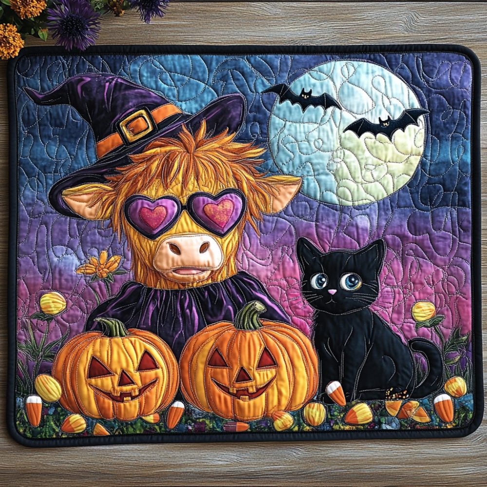 moonlit cow placemat, quilted placemat, Halloween table decor, farmhouse placemat, fall dining accessories, cotton placemat, spooky table decor, machine washable, seasonal placemat