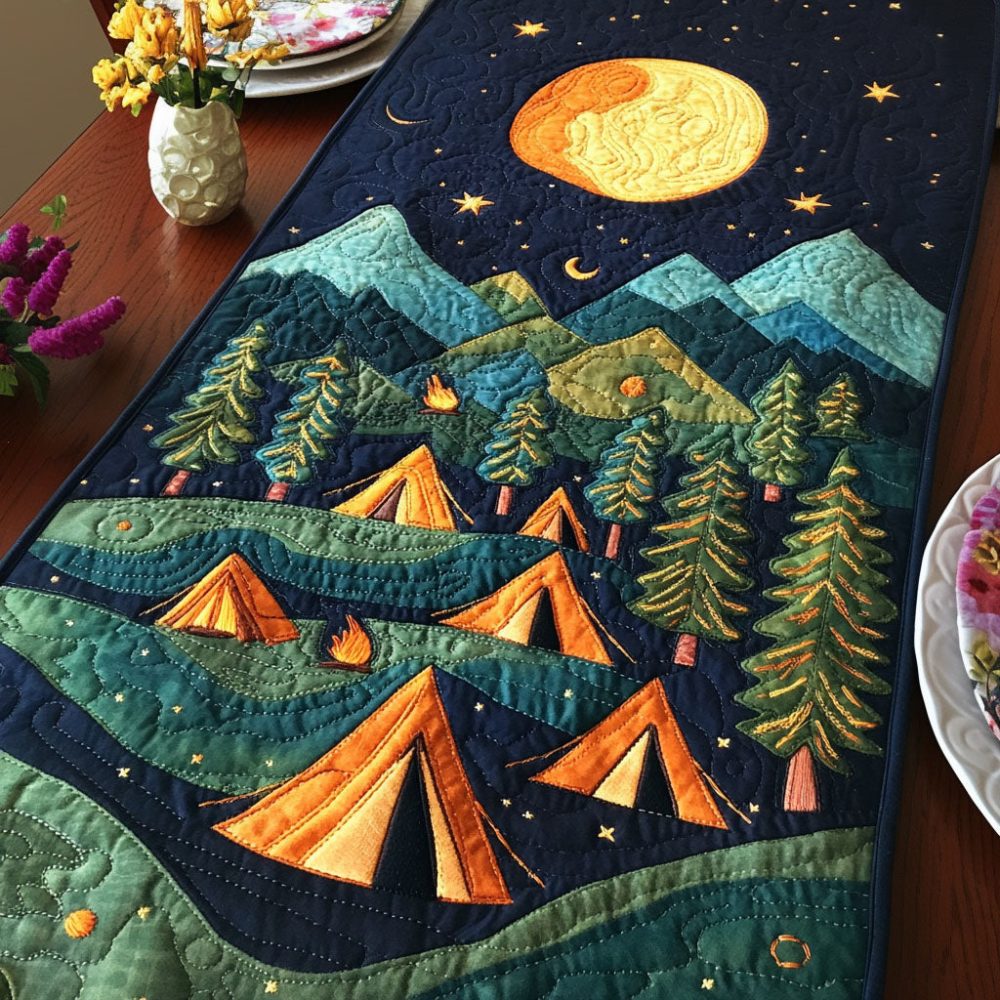 Moonlit Forest Tents Quilted Table Runner