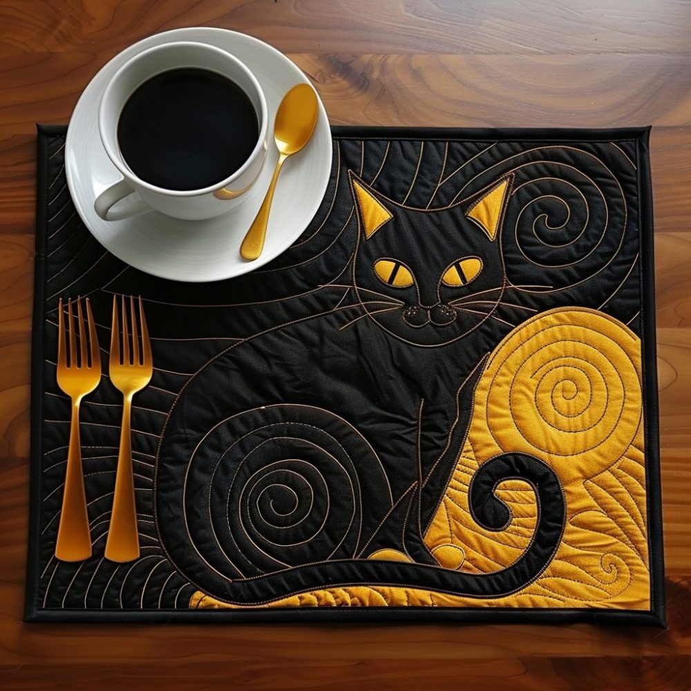 Bold and mysterious, the mystic black cat quilted placemat adds striking contrast to any table. Cotton-quilted with heat tolerance and a non-slip backing for secure placement — easy to launder and maintain.